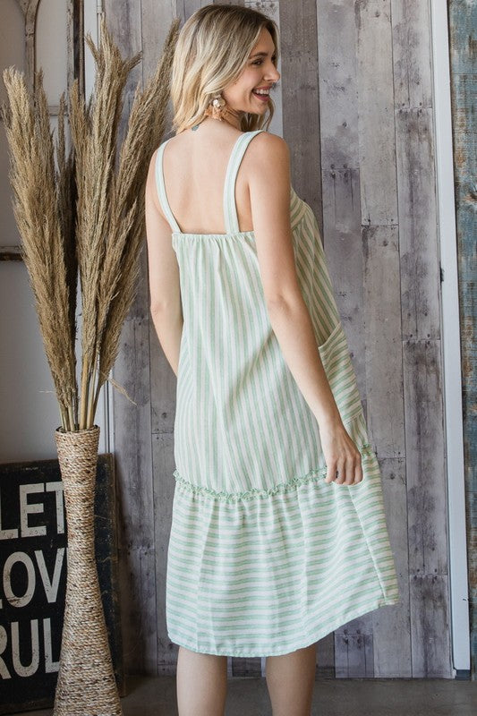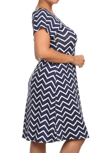DRESS- STRIPED MOCK NECKLINE BLUE DRESS WITH POCKETS