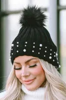 Accessory- Hat- Black Faux Pearl & Pompom Decor Cuff Beanie