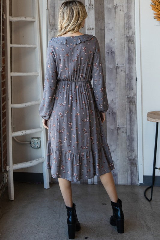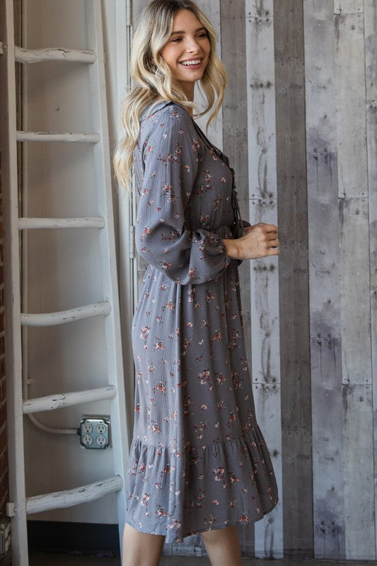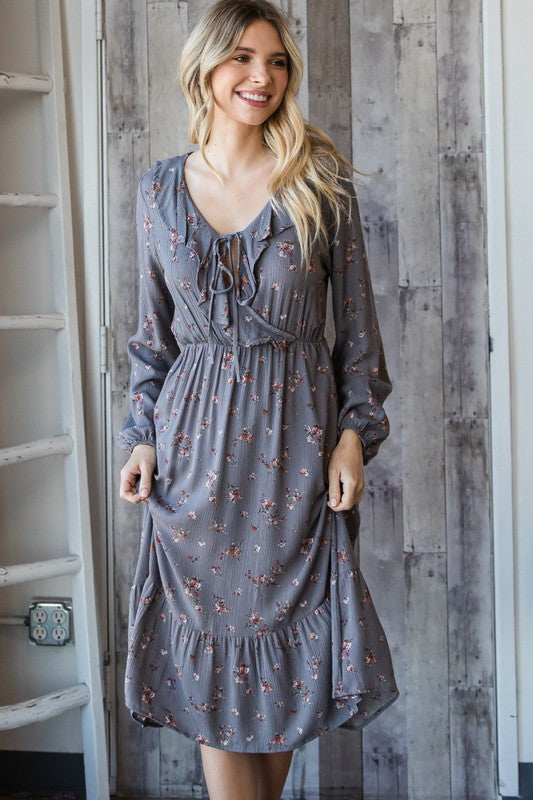 DRESS- FLORAL RUFFLED TIE FRONT MIDI DRESS