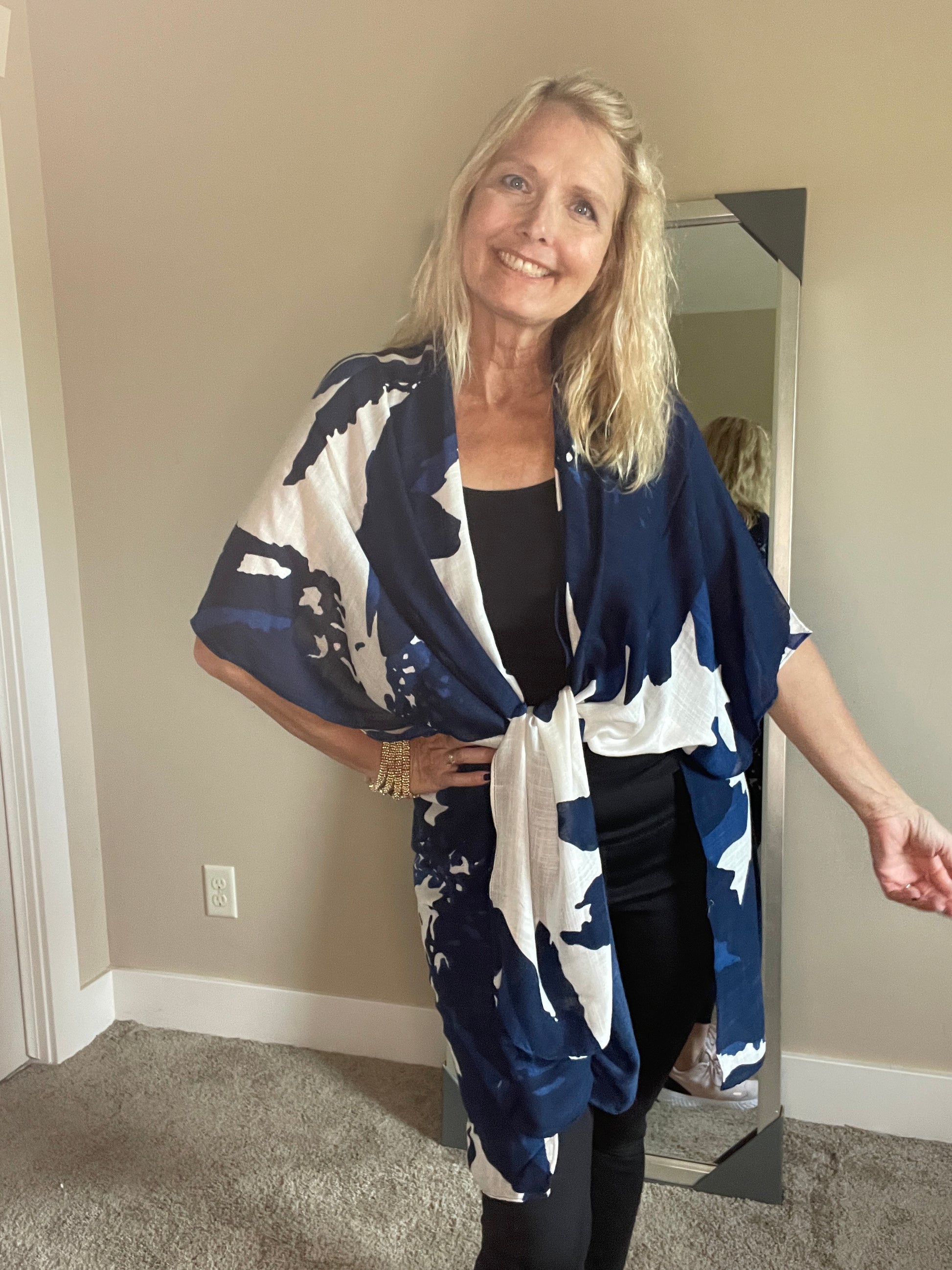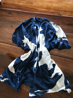 This kimono of stark white and deep inky blue calls me.... Flowing, soft and brilliant at once, it is the thing we all seek in our dreams. A hip length and gorgeous. If I don't keep it, you will love yours! 100% Viscose