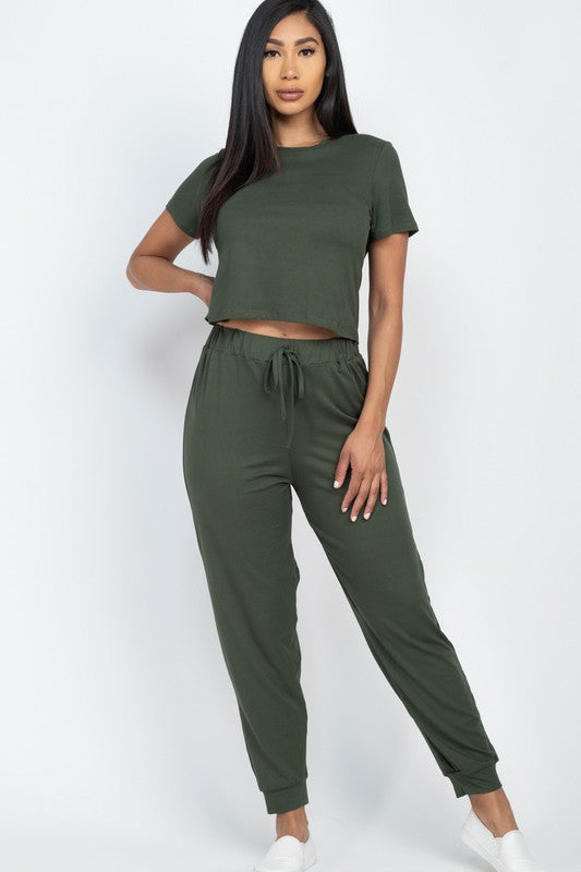This olive colored 2 piece set looks so nice but feels to casual! - Solid basic top and pants set - Stretch knit - Short sleeves - Elasticized waist with ribbon bow - 92% Polyester 8% Spandex
