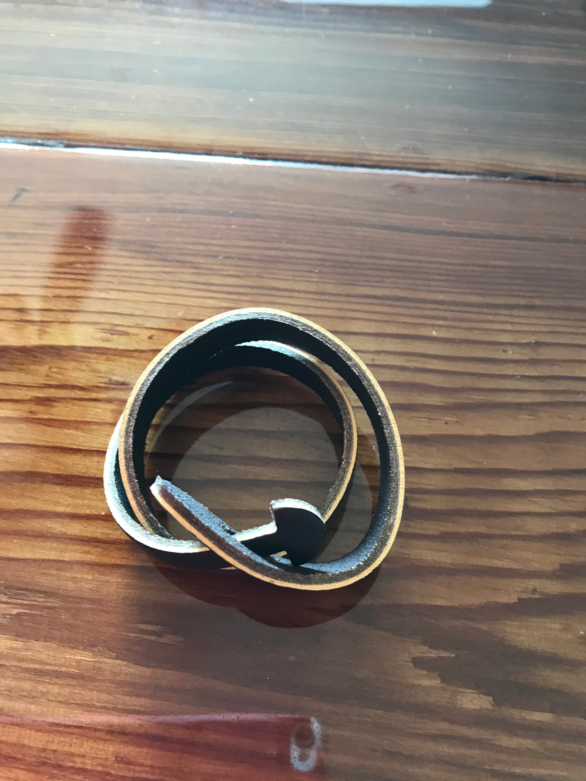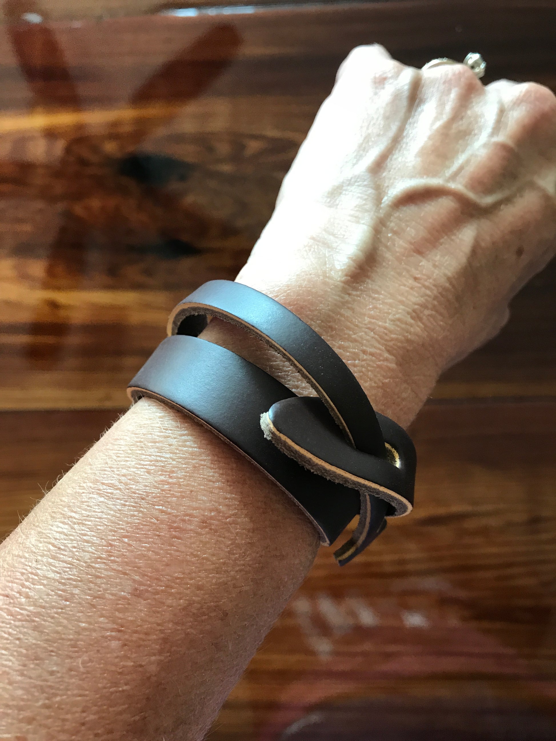 This simple statement leather cuff is exceptional in its edginess but simplicity. Wrapped around a wrist makes for a fun piece that's not like everyone else is wearing