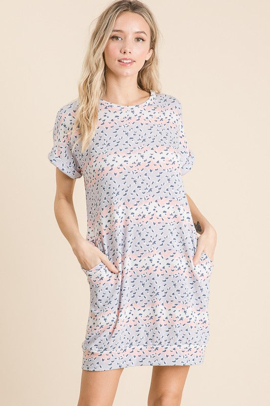 This is all the best feels in a dress. Casual, cozy lavender leopard and stripe dress- with POCKETS! Feels like a dream! Perfect length. Poly/rayon/spandex. Just the right blend to keep its shape but be comfortable and not cling!